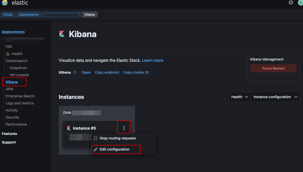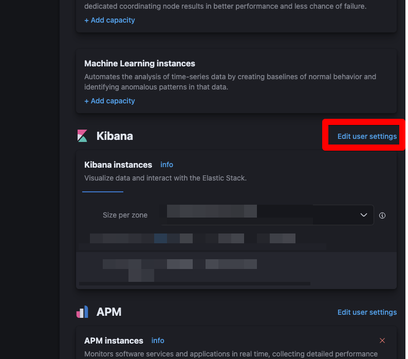 Edit user settings 클릭 Edit user settings을 클릭 하면 아래와 같이 kibana.yml을 덮어서 수정 할 수 있는 창이 열린다.