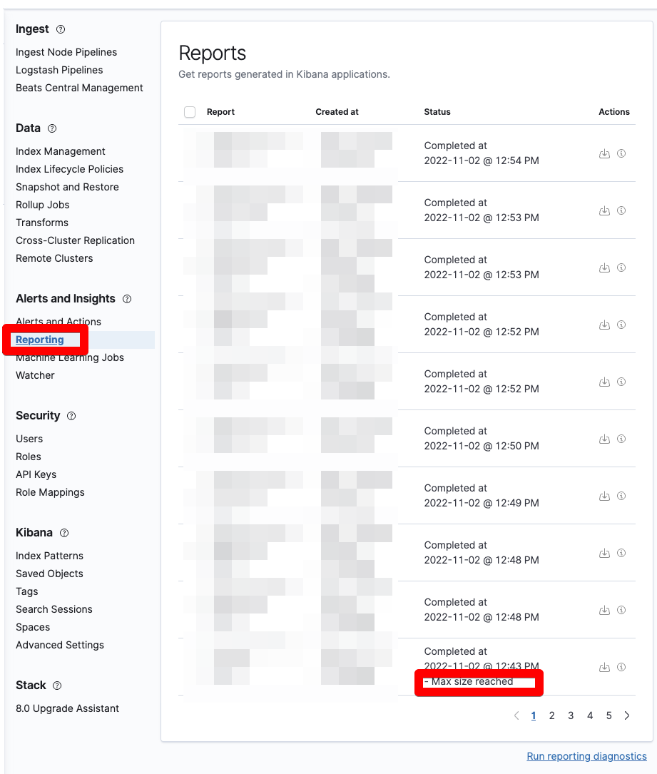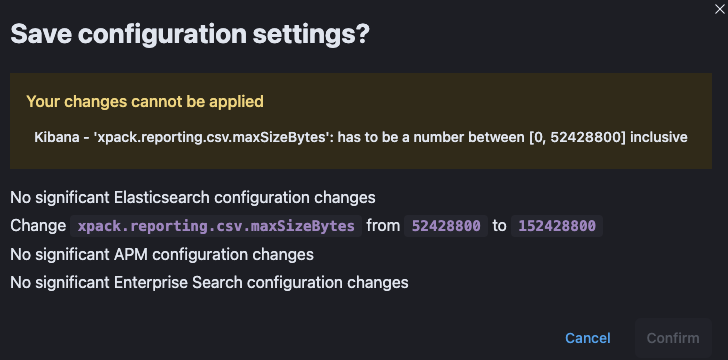 xpack.reporting.csv.maxSizeBytes 설정 항목이 키바나에서 reporting 용량을 조절 할 수 있는 옵션인데