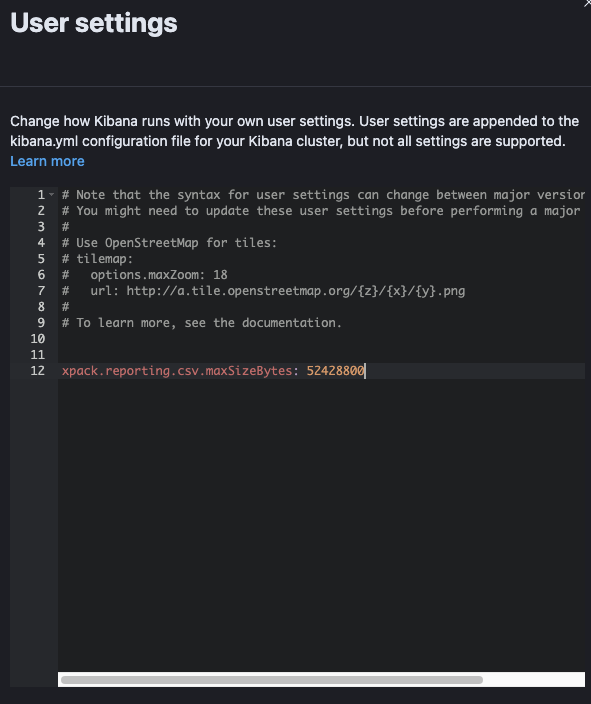 xpack.reporting.csv.maxSizeBytes: 52428800 를 입력해준다.