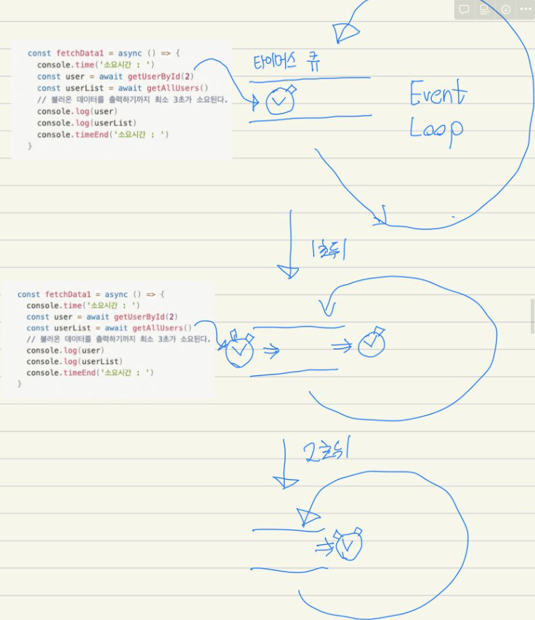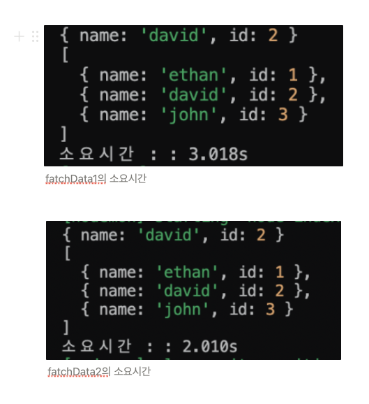 const userList = [ { name: 'ethan', id: 1 }, { name: "david", id: 2 }, { name: 'john', id: 3 } ]; // 1초가 걸리는 쿼리 const getUserById = (id) => { return new Promise((resolve, reject) => { setTimeout(() => { const [user] = userList.filter(user => user.id === id) resolve(user) }, 1000) }) } // 2초가 걸리는 쿼리 const getAllUsers = () => { return new Promise((resolve, reject) => { setTimeout(() => { resolve(userList) }, 2000) }) } const fetchData1 = async () => { console.time('소요시간 : ') const user = await getUserById(2) const userList = await getAllUsers() // 불러온 데이터를 출력하기까지 최소 3초가 소요된다. console.log(user) console.log(userList) console.timeEnd('소요시간 : ') } const fetchData2 = async () => { console.time('소요시간 :') // Promise.all() 은 실행할 비동기 태스크들이 담긴 배열을 인자로 받습니다. const [user, userList] = await Promise.all([getUserById(2), getAllUsers()]) console.log(user) console.log(userList) console.timeEnd('소요시간 :') } fetchData1() fetchData2()fetchData1의 경우