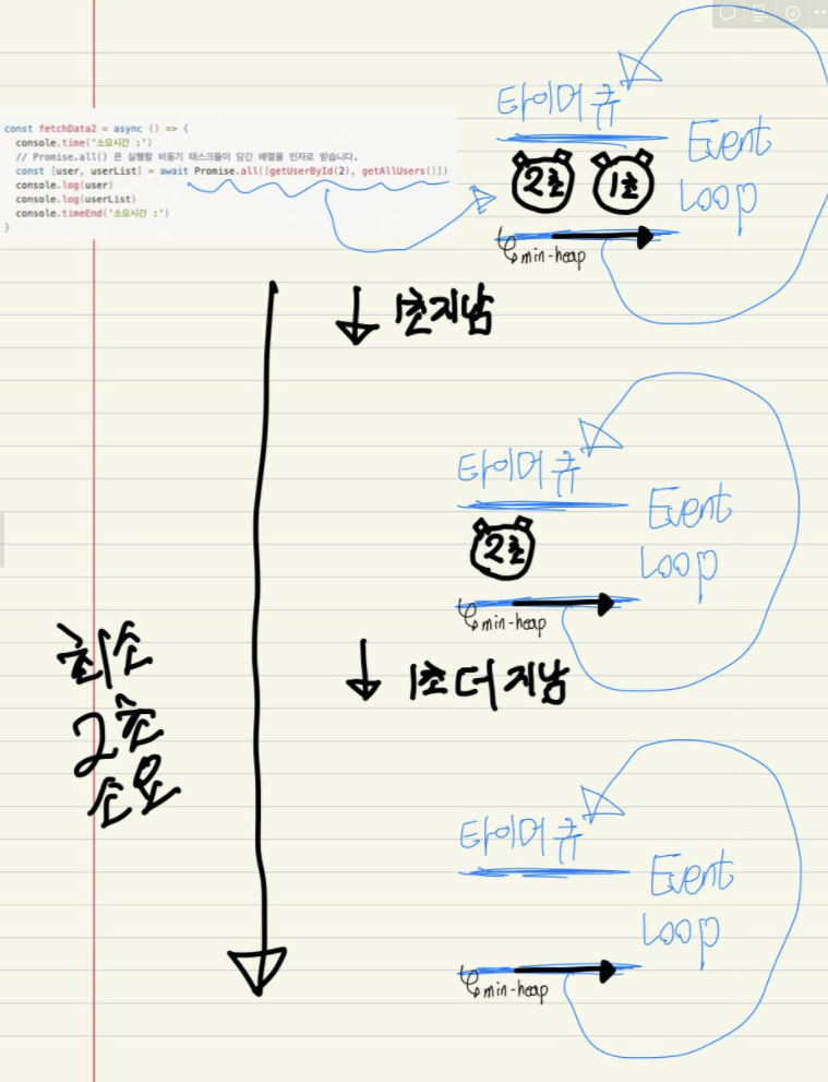 Promise.all()이 호출 되면서 두 타이머(1초짜리, 2초짜리)가 모두 타이머스 큐에 한번에 등록된다.
