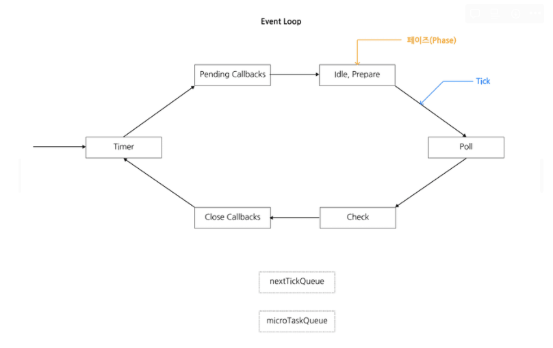 노드는 별도로 nextTickQueue, 와 microTaskQueue를 가지고 있는데,