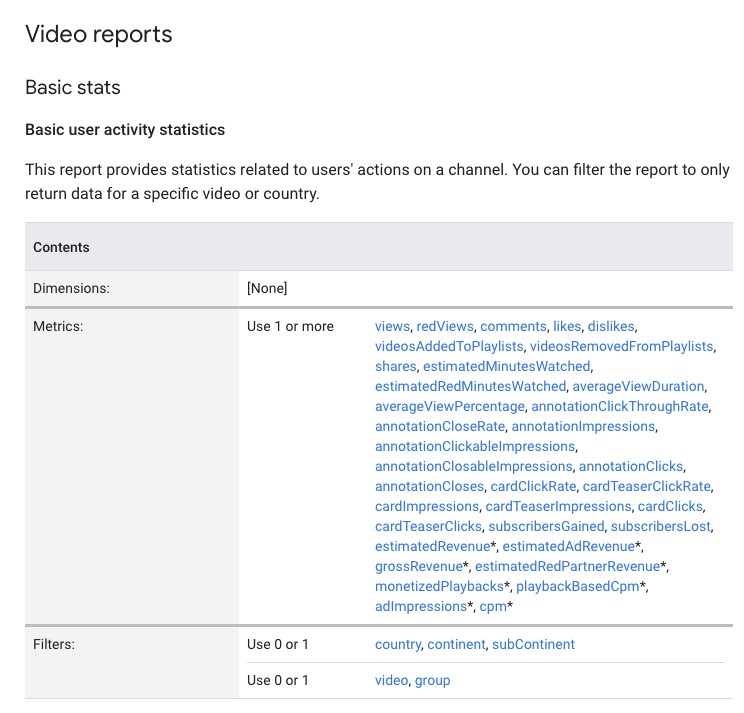 YouTube Analytics API 방식 으로 제공되는 Channel Reports에서 제공되는 Video Reports Video reports에서는 Video에 관한 지표들을 확인 할 수 있는데, country나 video 정보가 Metrics(=컬럼) 에 포함 되어있지 않고 Filters로 빠져있어서, 만약 채널 내 포함된 전체 비디오를 대상으로 각 비디오의 국가별로 조회수가 얼마나 나왔는지 데이터를 한번에 뽑아보는것이 불가능 하다