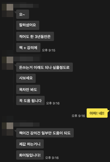 자신은 주말에 독서실에 가서 책을 읽었다고 했다. 그런데 요즘이라면 자신은 인터넷 강의를 하나씩 모아봤을 거라고 개발 지식 익히는 방법을 추천 해 주셨다.