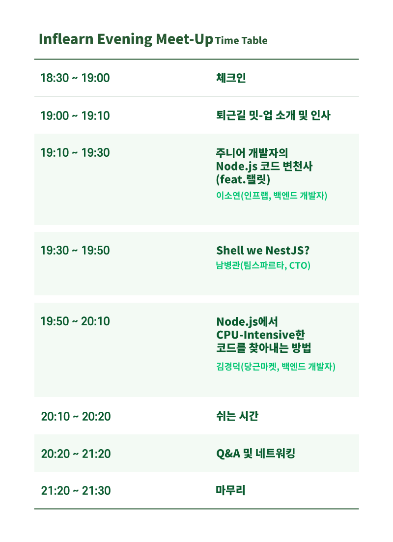 네! 돈쓰는거 이래도 되나 싶을정도로 앞으로 3년은 책이랑 인강을 사 모으겠습니다. 그리고 내가 사용하고 있는 기술이 있다면, 컨퍼런스나 밋업에 참가해보는 것도 좋은 방법이라고 알려주셨다. 그러면서 내가 NodeJS를 쓰니까 올해 처음 실시하는 인프랩 퇴근길 밋업을 추천 해주셨다.