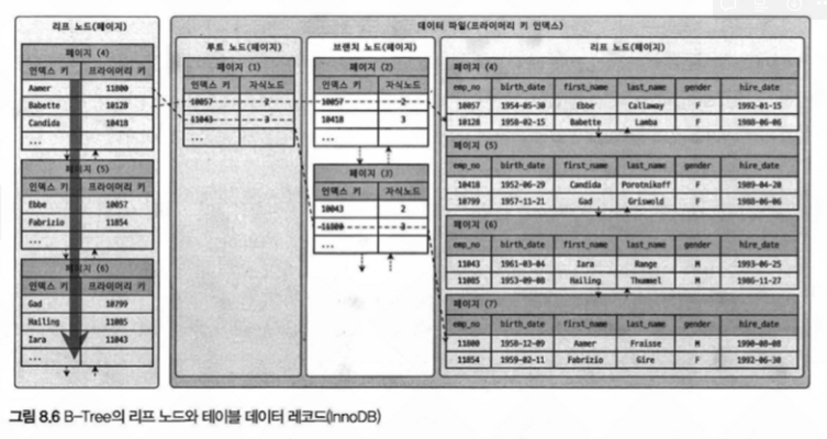 그렇기 때문에 리프노드에서 프라이머리 키를 찾았으면, 찾은 프라이머리 키로 실제 데이터를 찾기 위해 프라이머리 키 인덱스 B-Tree를 또 탐색하는 과정이 일어난다.(프라이머리 키 인덱스에는 리프노드에 실제 데이터가 들어가 있다. = 클러스터링 인덱스)