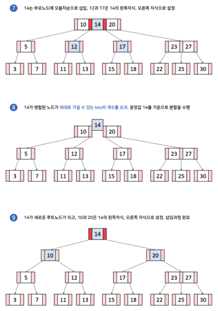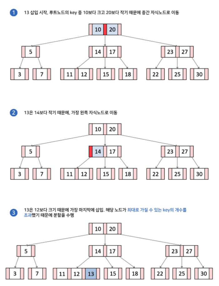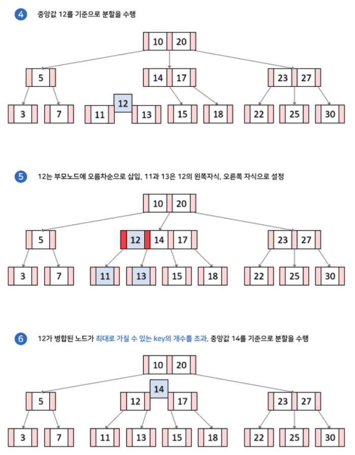(아래 예시 그림에서 각 노드가 최대로 가질 수 있는 키의 갯수는 2개라고 하자)