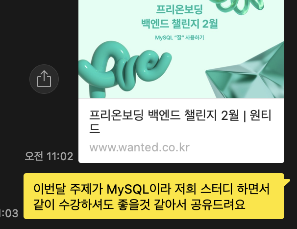 1월 프리온보딩 과정을 수강하면서 강사분이 직접 실시간으로 코드리뷰도 해주시고, 강사분을 통해 새롭게 알게된 내용이 많아서 4회라는 시간이 너무 짧게 느껴졌었다. 그래서 2월 과정도 또 신청했다. 2월 과정은 MySQL이 주제인데 마침 딱 2월부터 RealMySQL 스터디도 시작 되기 때문에 함께 수강하면 스터디로 얻지 못하는 인사이트도 강의를 통해 얻을 수 있을 것 같다.