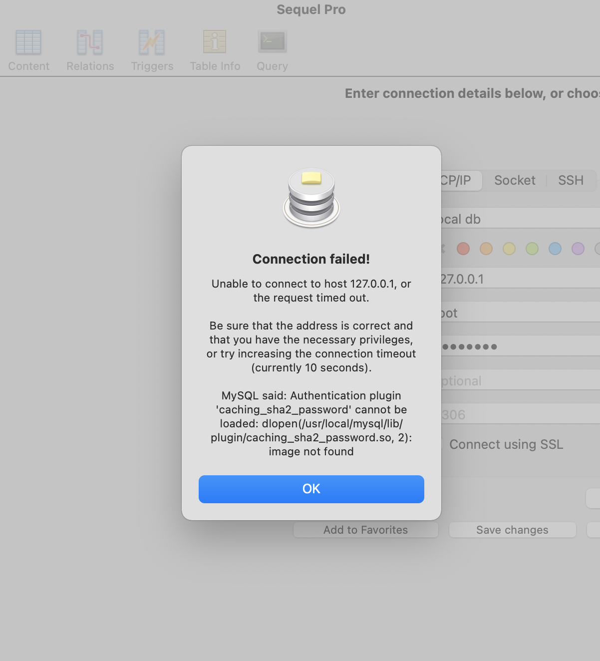 로컬에 mysql DB를 설치 후 Sequal Pro로 접속 시도시 Authentication plugin 'caching_sha2_password' cannot be loaded 에러가 발생.