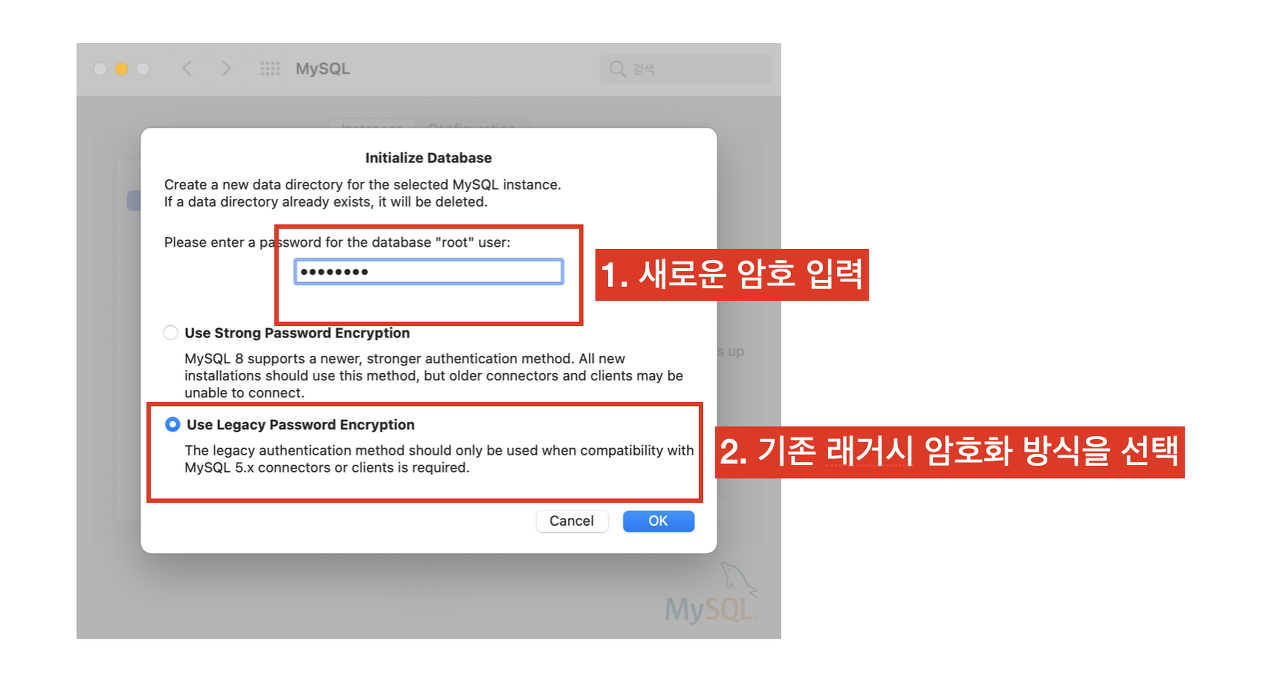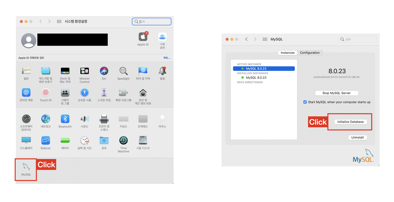 시스템 환경설정(mac OS 기준)에 접속 후 MySQL 클릭 -> Initialize Database 버튼 클릭
