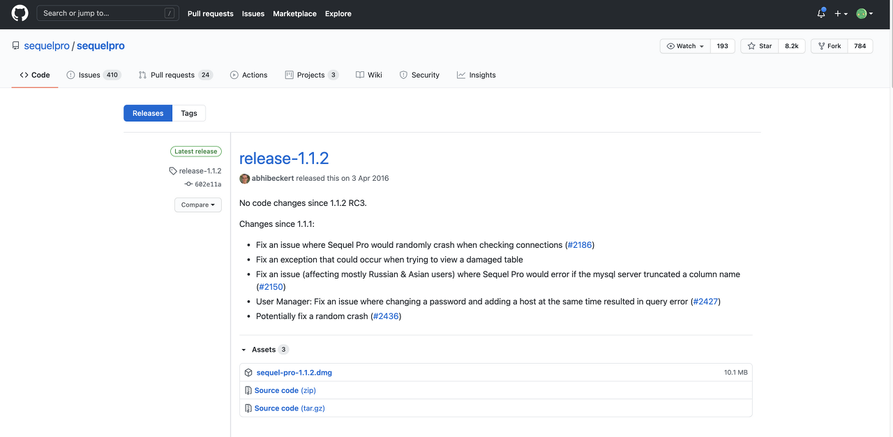Sequel Pro 2016년 이후로 릴리즈가 없는 모습...