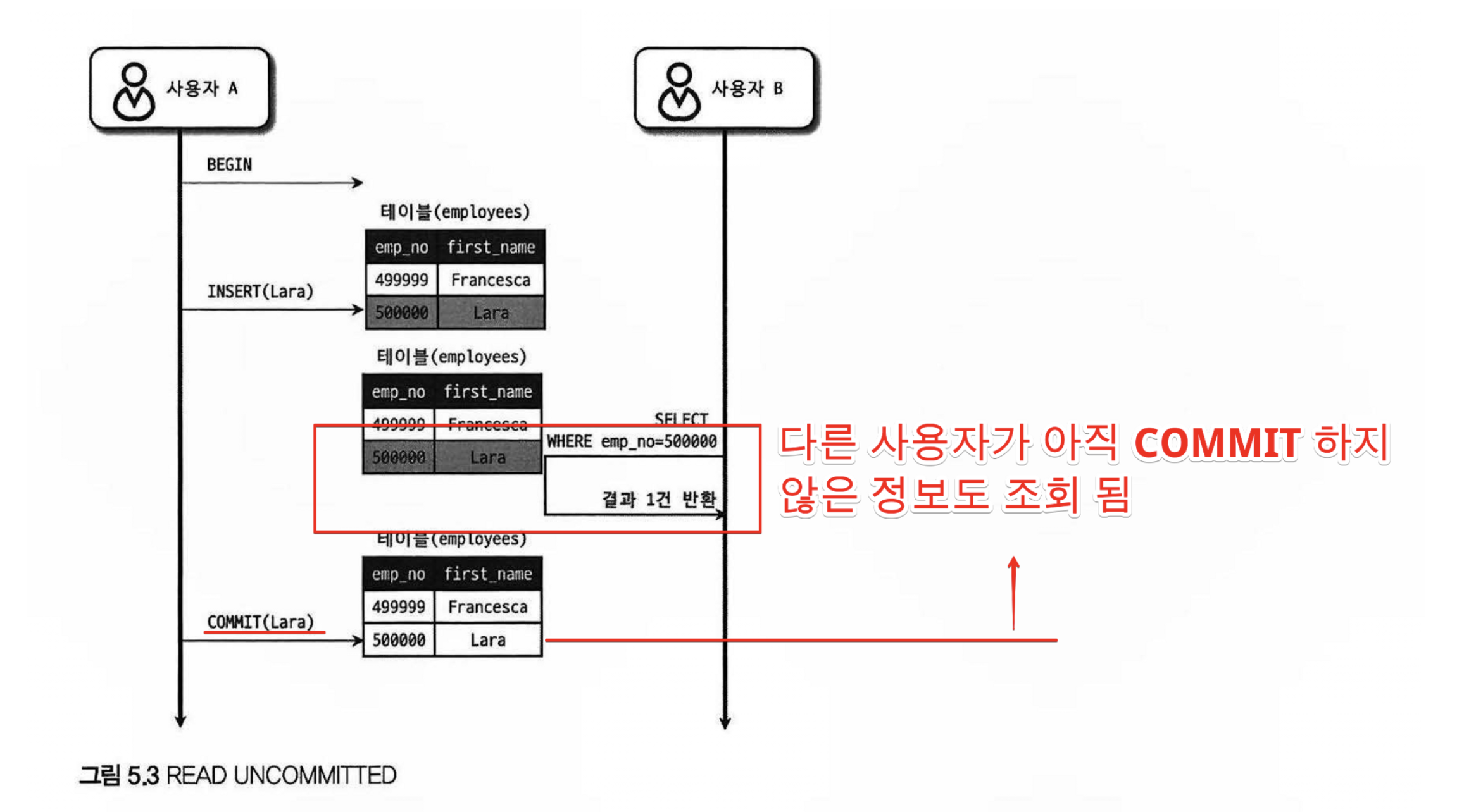 READ UNCOMMITED의 경우 RDBMS 표준에서 트랜잭션의 격리수준으로 인정하지 않을 정도로 정합성에 많은 문제가 있다.