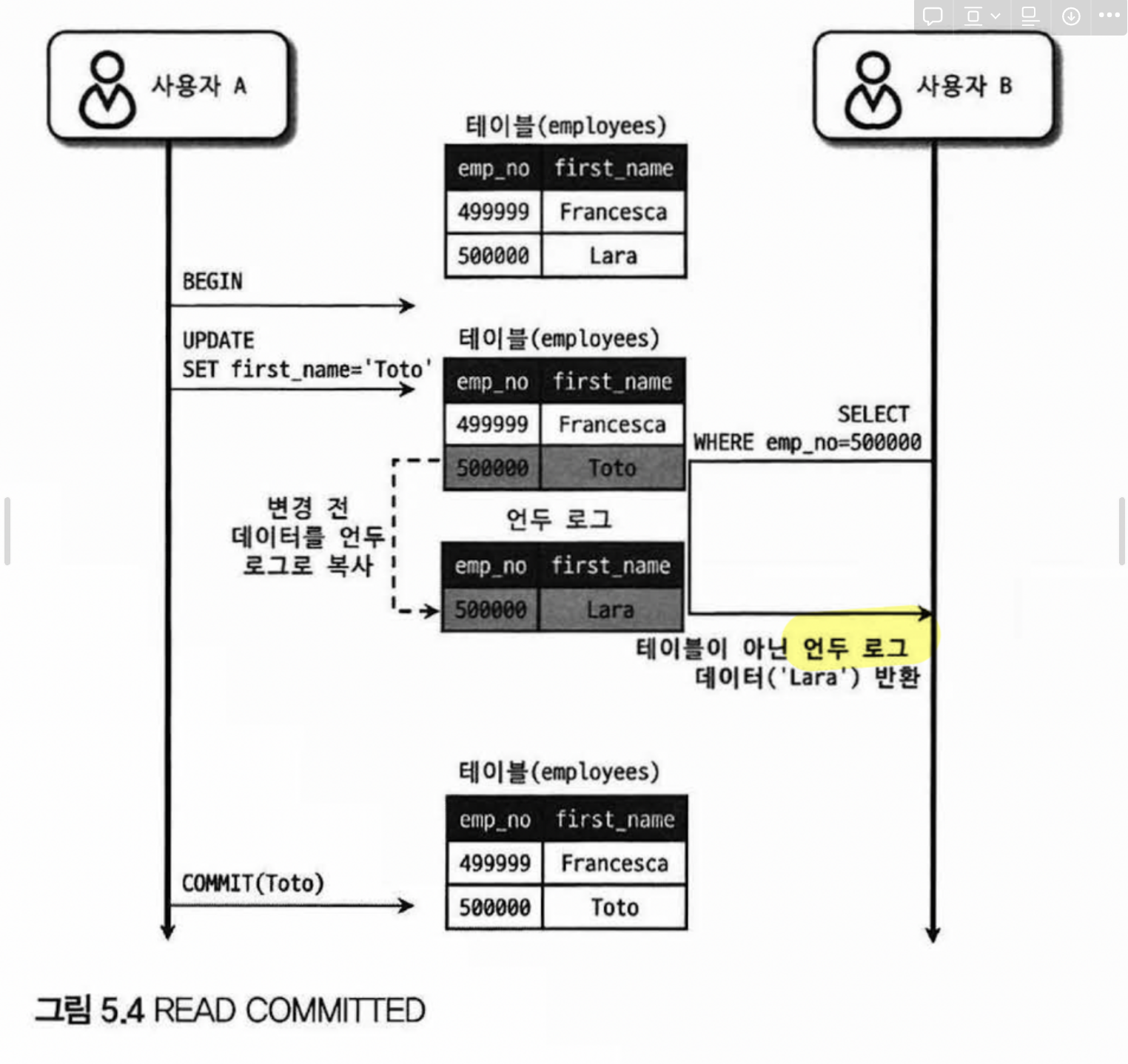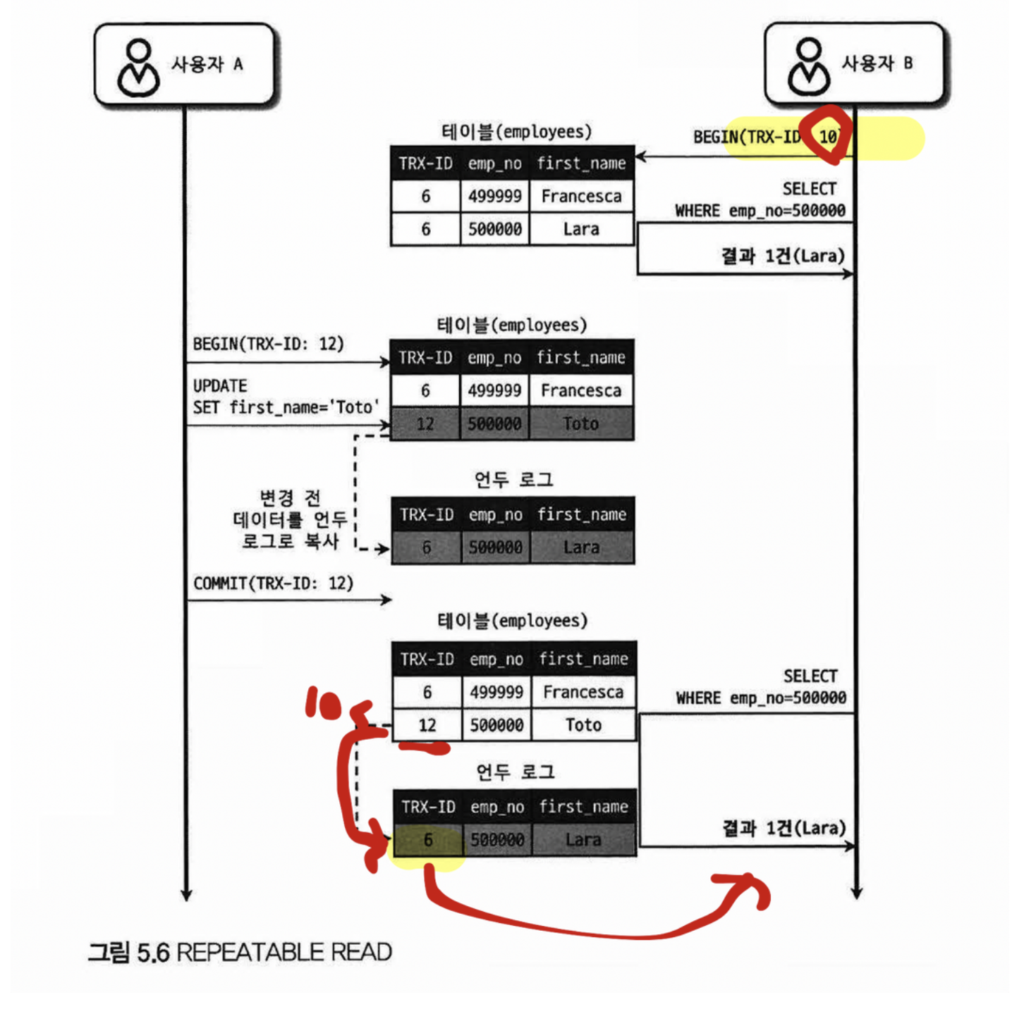 사용자 B의 트랜잭션이 실행되는 도중 사용자 A의 트랜잭션에서 데이터의 변경이 일어났다. REPEATABLE READ에서는 한 트랜잭션 내에서의 같은 SELECT는 항상 같은 결과를 내야 하므로, 사용자 B의 트랜잭션 이후에 BEGIN 된 사용자 A의 COMMIT내용을 읽지 않고, 언두로그에 기록된 데이터를 대신 읽는다.