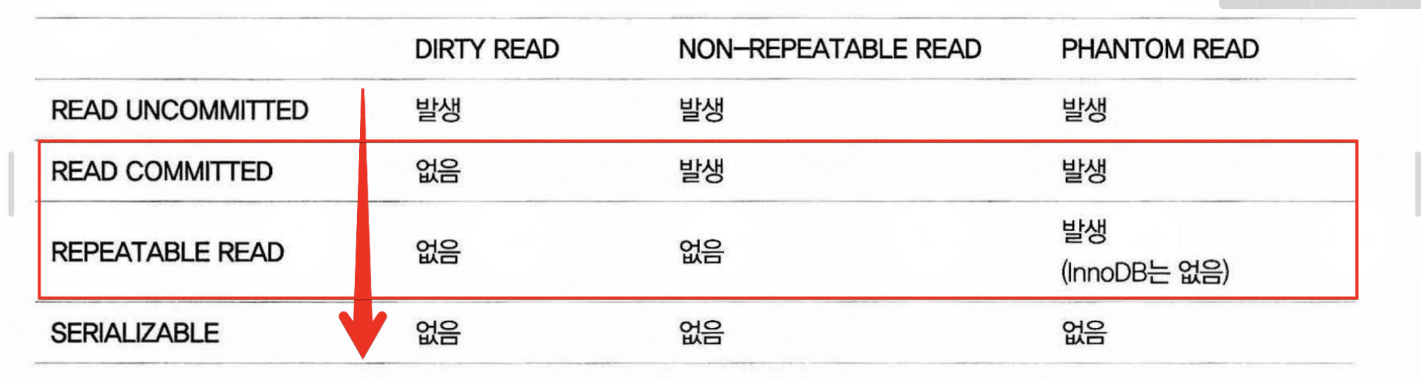 위 표에서 아래로 갈수록 격리 수준이 높아지고,