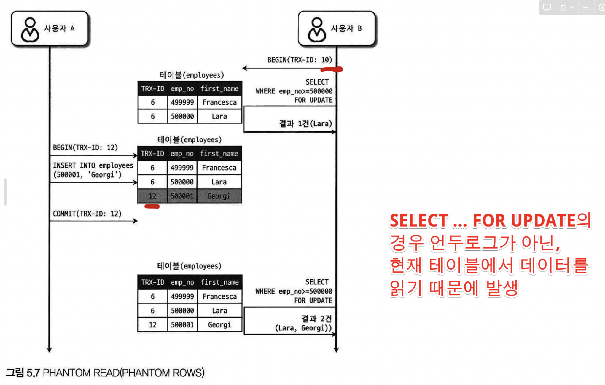 SELECT … FOR UPDATE 또는 SELECT … FOR SHARE 문은 언두 레코드에 잠금을 걸 수 없다는 특성이 있다. 사용 시, 다른 트랜잭션에서 수행한 변경 작업에 영향을 받아 Phantom Read 문제가 발생 할 수 있다.