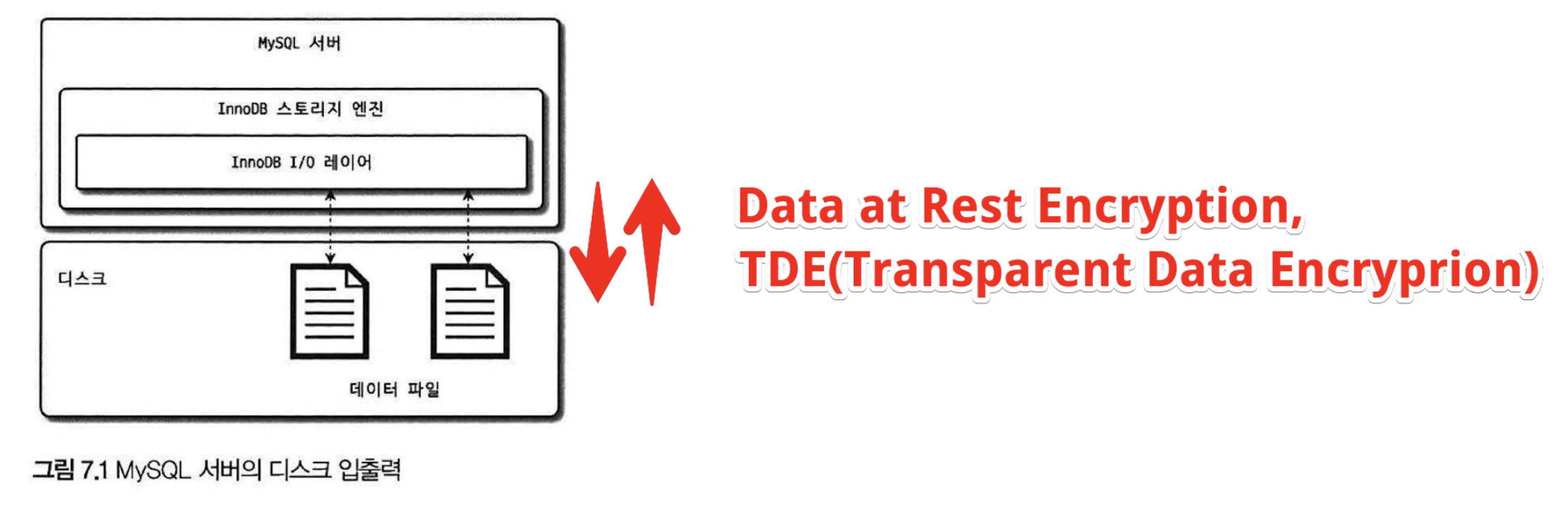MySQL 에서 암호화된 데이터는 MySQL 서버와 디스크 사이에 읽기 쓰기 작업에서 만 일어나기 때문에 MySQL 서버 내에서 사용자의 쿼리를 처리하는 과정에서는 테이블의 데이터가 내부적으로 암호화 처리되어 있는지 여부를 식별하거나 신경쓸 필요가 없는데, 이러한 암호화 방식을 TDE(Transparent Data Encryption)라고 한다.