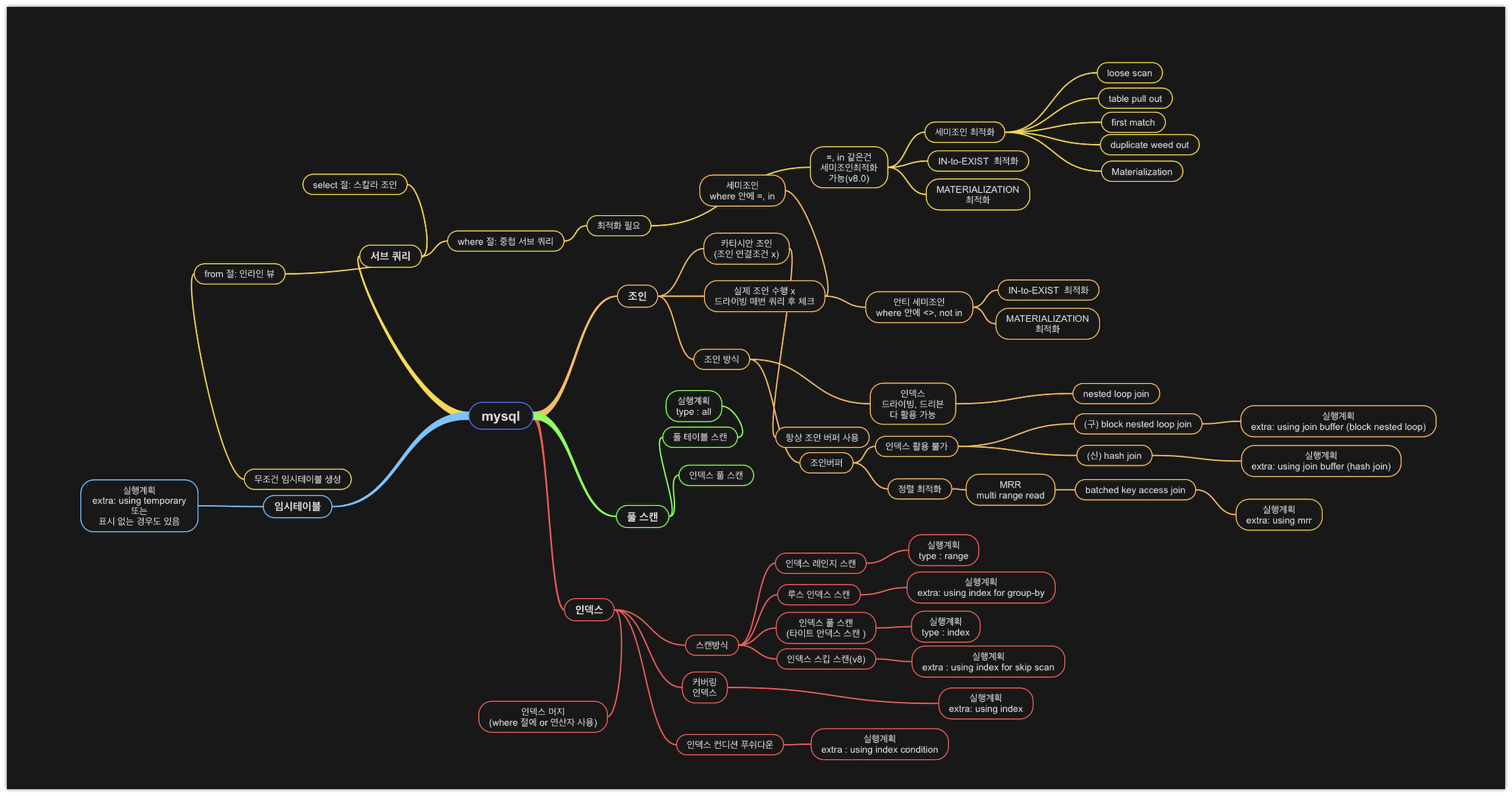 스터디를 하면서 다른 분이 자신이 쿼리 최적화 한 내용을 예시로 보여주셨는데, 마인드맵을 같이 보면서 아 이래서 임시테이블이 생성된것이였구나! 한눈에 파악 할 수 있었다.