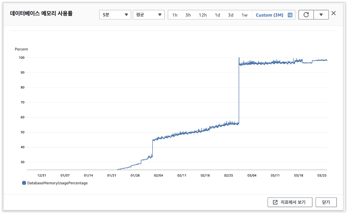 3월에 갑자기 redis 메모리 사용율이 증가했는데, 그 원인은 2월과 3월에 한번씩 처리에 실패한 로그를 redis에 잠시 담아두도록 로그 처리 서버를 업데이트 했기 때문이였다. 그리고 redis 메모리 사용량도 너무 적게 설정 되어있었다.(300MB 수준) 일단은 redis 메모리 사용량을 올리고, 처리에 실패한 로그를 굳이 리소스를 잡아먹어가며 인메모리에 담아둘 필요는 없을 것 같아서 이부분도 S3와 같은 파일형태로 따로 저장하도록 로그 파이프라인을 수정했다.