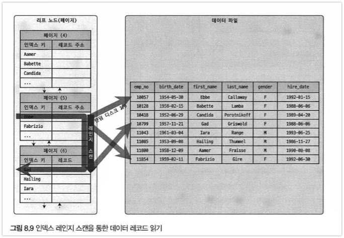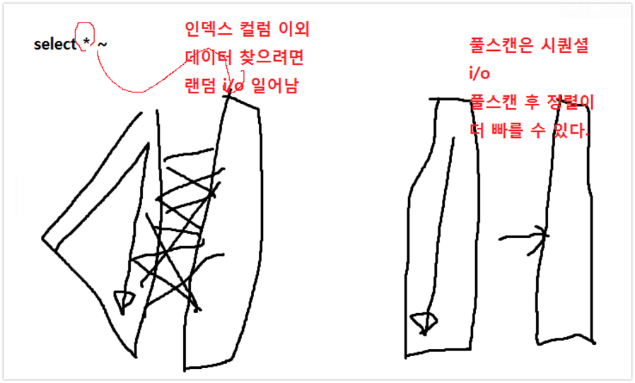 결국 아래 그림처럼 레인지 스캔의 범위가 크고, 인덱스 테이블에 없는 컬럼을 조회 한 경우 나머지 컬럼 데이터를 디스크에서 일일히 랜덤하게 가져와야 하기 때문에 랜덤 I/O가 아닌 시퀀셜 I/O로 처리되는 풀스캔으로 데이터를 처음부터 끝까지 전부 가져와 필요한 부분만 걸러내는 것이 더 빠를거라 판단했기 때문이다.