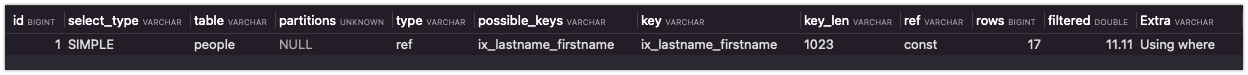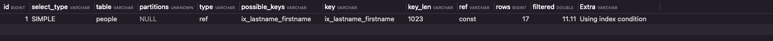 ALTER TABLE people ADD INDEX ix_lastname_firstname (last_name, first_name);index_condition_pushdown=off 결과