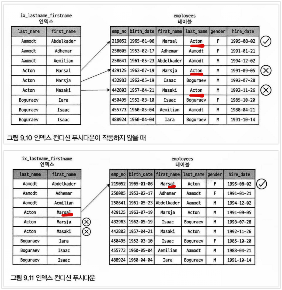 복합인덱스 테이블에서 인덱스를 활용하지 못하는 조건이라도 인덱스 테이블 내에서 모든 체크 조건을 처리할 수 있으면, 불필요한 랜덤 디스크 I/O 읽기를 수행 하지 않는다.